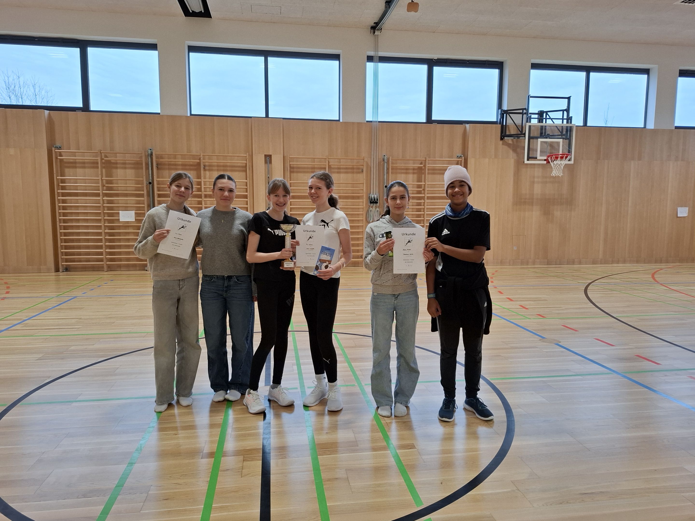 Die Badmintonmeisterschaften der Mädchen blicken auf eine mittlerweile 20-jährige Tradition zurück: Was damals klein begann, ist längst selbstverständlicher Bestandteil im vorbereitenden Unterricht mit intensivem Techniktraining und spannenden Spielen zu Vorausscheidung. Die jeweils zwei besten Spielerinnen jeder Klasse gingen ins Turnier, gespielt wurde Doppel.