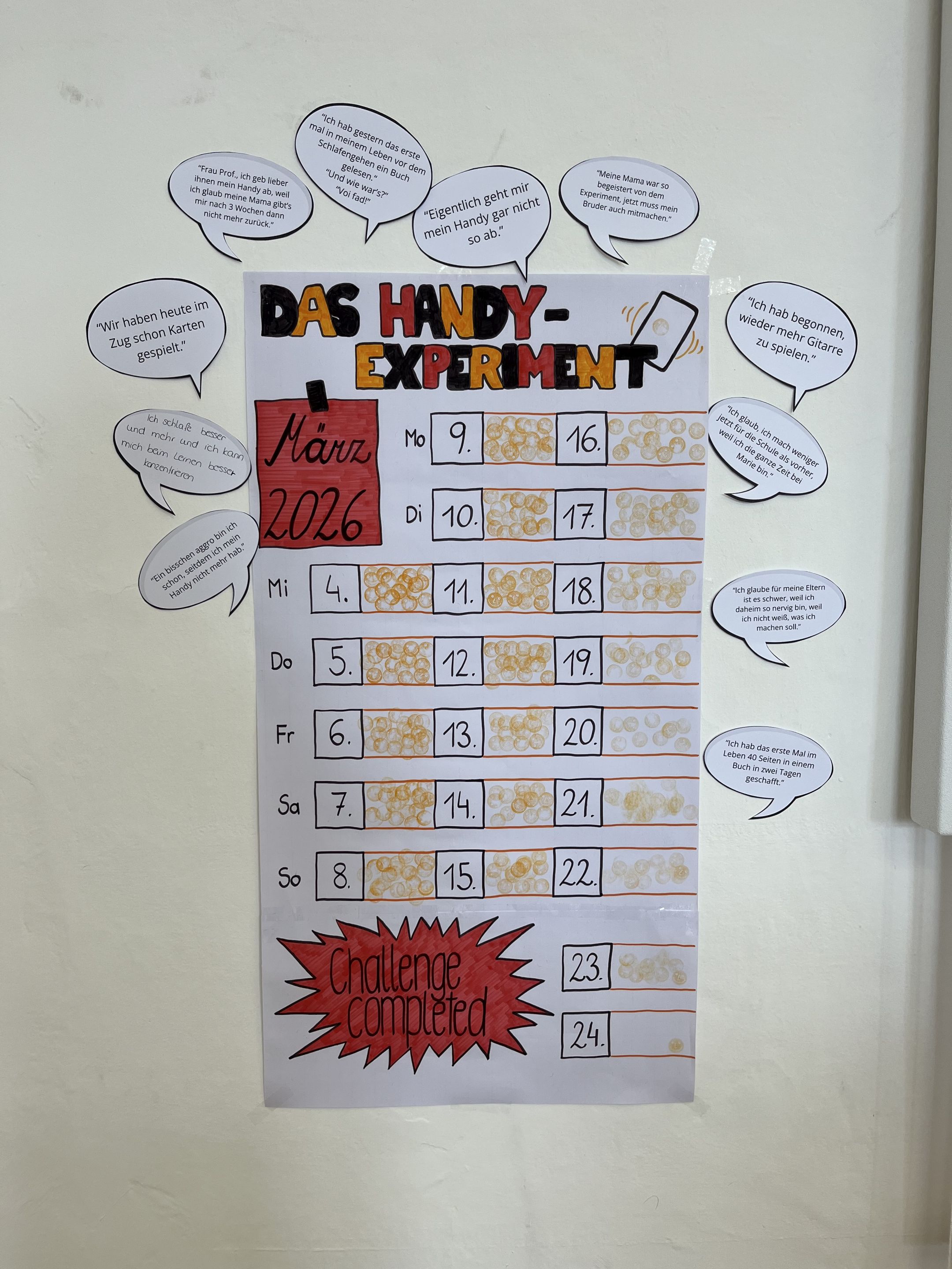 Gemeinsam mit tausend weiteren Schülerinnen und Schülern nahm die 4a von 04.03.-24.03.2026 am österreichweiten Handyexperiment teil. Dabei konnte jede/r selbst wählen, ob und in welchem Ausmaß man aufs Smartphone oder auf bestimmte Apps verzichten wollte. Einige gaben das Handy sogar für 3 Wochen komplett in der Schule oder daheim den Eltern ab, andere schalteten (wie ich selbst ebenso) das Internet und den WLAN-Empfang für 3 Wochen ab, wieder andere löschten Apps wie TikTok oder Snapchat vom Handy für diese Zeit.
