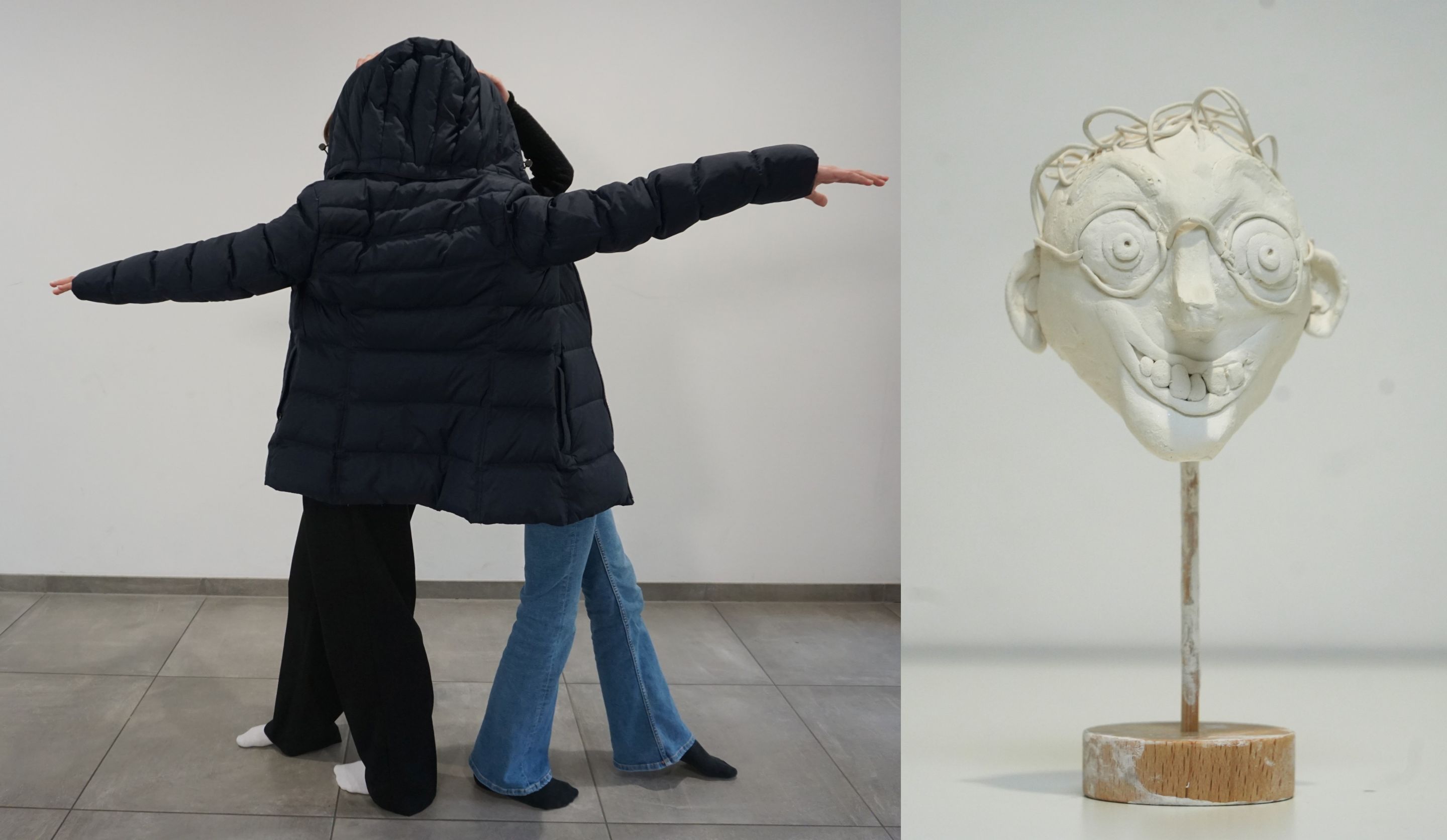 Andererseits entwickelten die Schüler*innen in Anlehnung an den österreichischen Künstler Erwin Wurm sogenannte „One-Minute-Sculptures“. Dieser lud die Besucher*innen seiner Ausstellungen dazu ein, selbst zum Kunstwerk zu werden. Nach einer grafischen Anleitung muss man eine Minute lang in einer teils schwierigen oder lustigen Pose verharren und wird dabei zur Skulptur.